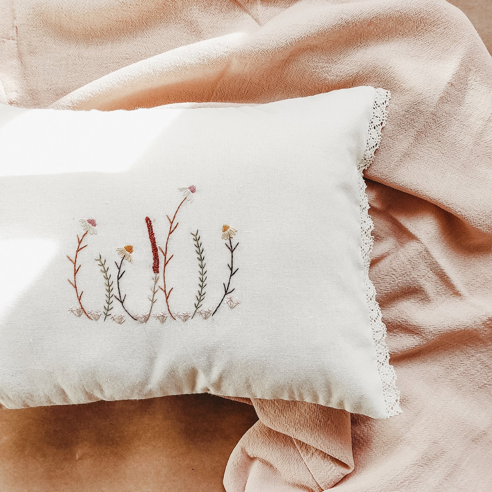 Funda de almohadon en lienzo crudo de algodon bordado a mano, con detalle de puntilla en ambos lados.