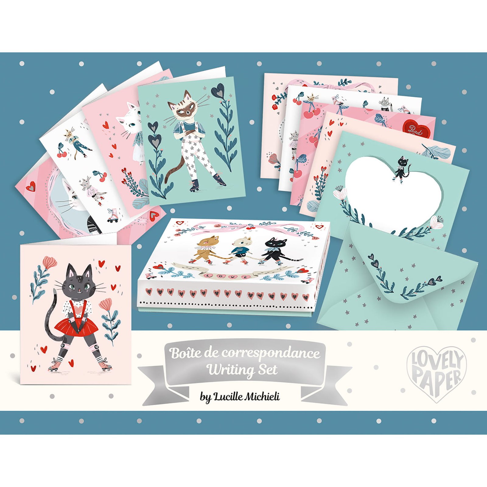 Caja de escritura, ilustrada con gatitos.