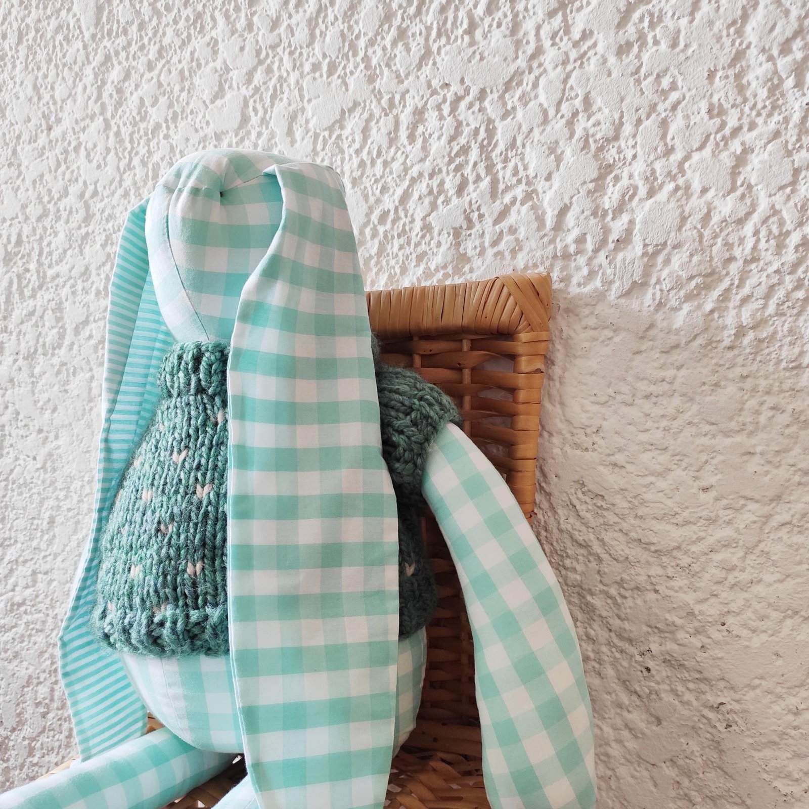 Estampa a cuadros verde agua, sweter tejido a mano.