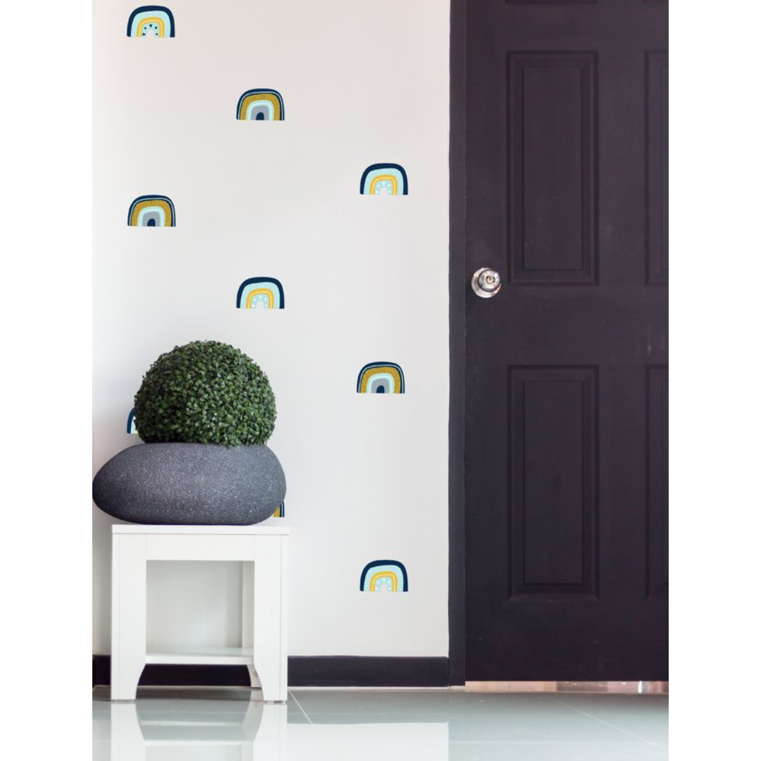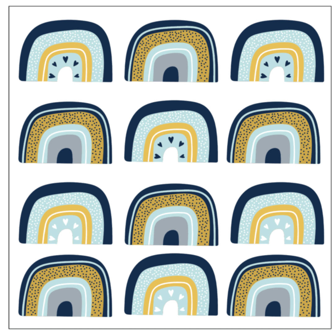 Lámina de 30 x 30 cm con 12 vinilos arcoíris en versión celeste, mostaza y gris.