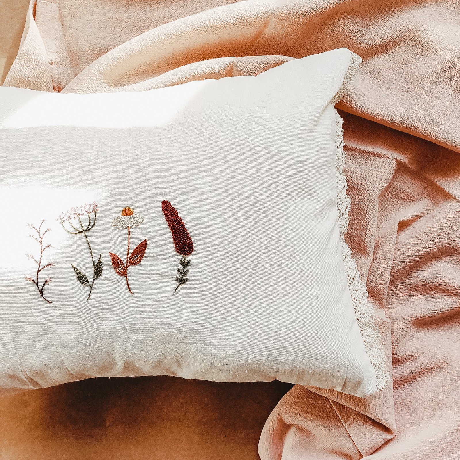 Funda de almohadón en lienzo crudo de algodón bordado a mano, con detalle de puntilla en ambos lados.
